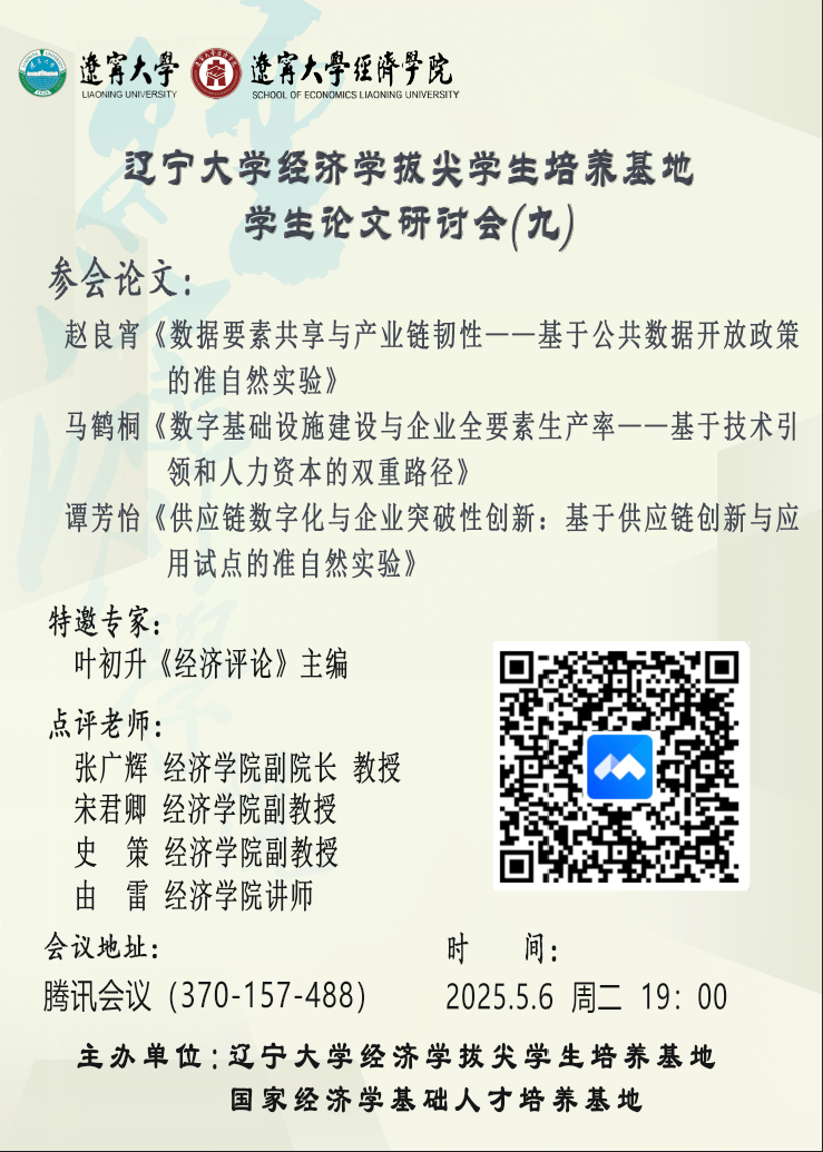 2025年5月6日,beat365唯一官网经济学拔尖学生培养基地举办第9期学生论文研讨会,研讨会邀请《经济评论》主编、教育部人文社科重点研究基地武汉大学经济发展研究中心联席主任叶初升教授担任特邀点评专家,beat365唯一官网副院长张广辉教授、宋君卿副教授、史策副教授和由雷讲师担任点评老师。2022级赵良宵、马鹤桐、谭芳怡三位同学分别围绕各自研究论文进行汇报,与点评专家就论文框架构建、研究方法运用及学术规范等展开深入探讨。