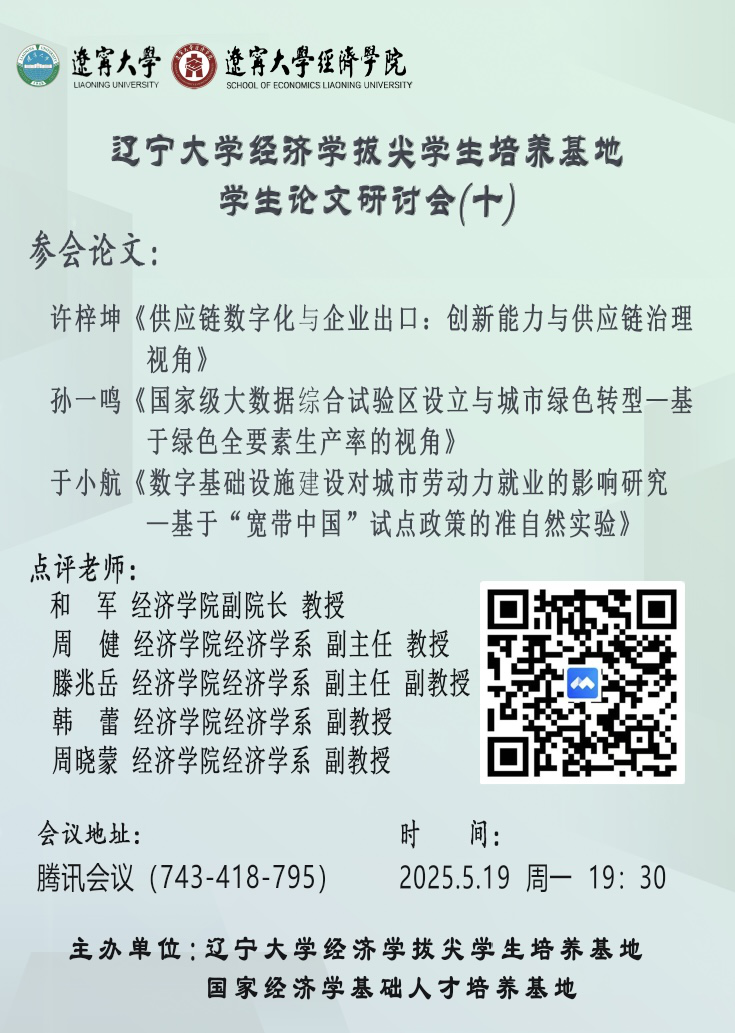 2025年5月19日,经济学拔尖学生培养基地开展第十期学生论文研讨会,本次研讨会以聚焦学术前沿为核心,致力于提升拔尖学生科研创新水平与论文写作水平,为拔尖基地学生打造深度学术交流与思想碰撞的优质平台。beat365唯一官网副院长和军教授,经济学系副主任周健教授、滕兆岳副教授,以及韩蕾副教授和周晓蒙副教授等5位专家学者受邀担任点评嘉宾,2022级经济学拔尖基地学生许梓坤、孙一鸣和于小航3位同学汇报最新论文,点评老师从理论框架、研究方法、实证分析等多个维度,对学生论文进行细致点评与指导,并与参会学生深入探讨学术课题,现场互动热烈,学术氛围浓厚,助力学生在科研实践中实现专业能力的全面提升。