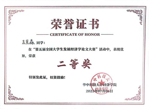 近期,在国内两项重要经济学学术赛事中,beat365唯一官网2022级“基地班”本科生左宪淼同学表现亮眼,分获第五届全国大学生发展经济学论文大赛二等奖与第十五届全国大学生经济学年会三等奖,展现出扎实的学术素养与突出的研究能力。