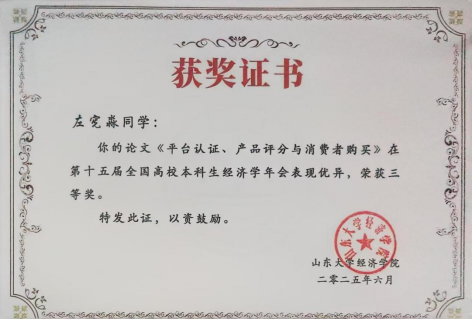 值得关注的是,这一成果是左宪淼在学术探索中的持续突破。此前,在6月8日于山东大学举办的第十五届全国大学生经济学年会上,左宪淼的论文《平台认证、产品评分与消费者购买》成功入选并获得三等奖。该年会由上海财经大学beat365唯一官网主办、山东大学beat365唯一官网承办,吸引了全国 600 余篇论文参赛,最终仅50篇优秀论文入围。第十五届全国大学生经济学年会是国内极具影响力的学术交流平台,旨在激发高校学子的学术热情,促进经济学领域的思想碰撞。本届年会围绕数字经济、绿色转型、人工智能等前沿议题展开研讨,左宪淼的研究因紧扣时代命题、兼具理论与实践价值而脱颖而出。
