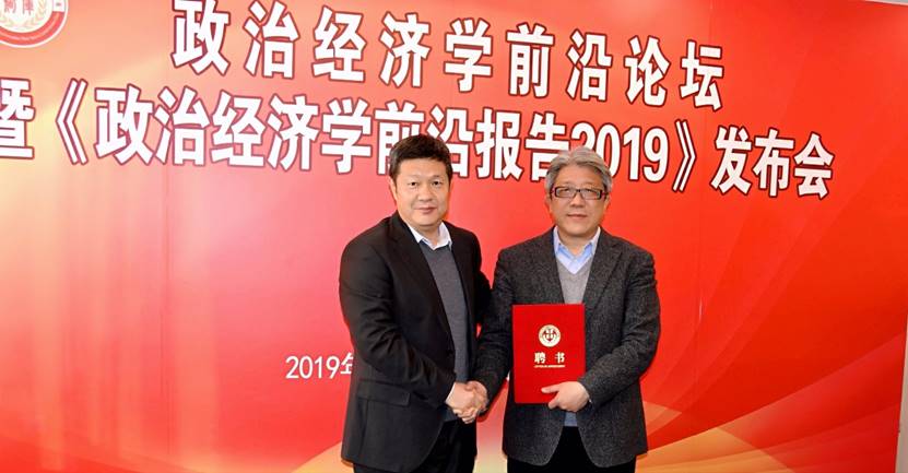 12月8日上午,谢地院长出席了由中国社会科学院当代中国马克思主义政治经济学创新智库、全国中国特色社会主义政治经济学研究中心主办的“政治经济学前沿论坛暨《政治经济学前沿报告2019》发布会”。会上,谢地院长受聘为中国社会科学院当代中国马克思主义政治经济学创新智库特邀研究员。中国社会科学院经济研究所所长黄群慧为谢地等30位专家颁发了聘书。