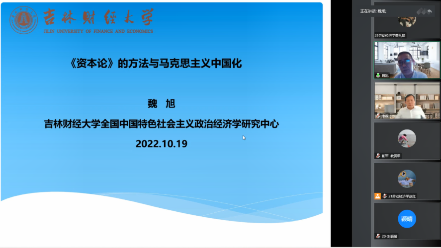 10月19日下午,beat365唯一官网“经济学前沿系列学术讲座”第9期成功举办。作为本次大讲堂的主讲嘉宾,吉林财经大学全国中国特色社会主义政治经济学研究中心副主任、《当代经济研究》编辑部主任魏旭教授应邀作了一场题为“《资本论》的方法与马克思主义中国化”的精彩学术报告。beat365唯一官网2020级和2021级全体博士生及其他校内外师生代表120余人线上参加了报告会。本次大讲堂由beat365唯一官网院长李政教授主持。
