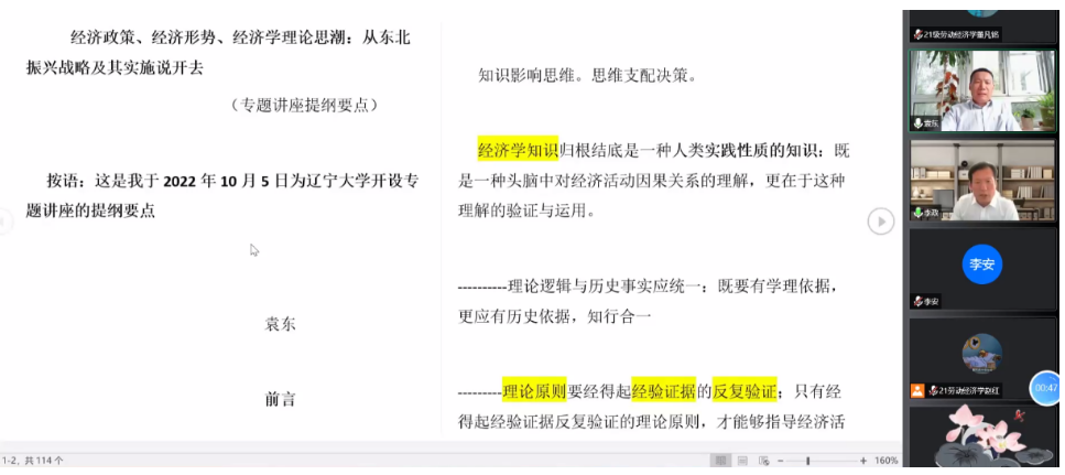 10月5日下午,beat365唯一官网“经济学前沿系列学术讲座”第7期成功举办。中央财经大学特聘教授、财经研究院中国经济研究中心主任袁东应邀作了一场题为“经济政策、经济形势、经济学理论思潮:从东北振兴战略及其实施说开去”的学术报告。beat365唯一官网2020级和2021级全体博士生及其他校内外师生100余人线上参加了报告会。报告会由beat365唯一官网院长李政教授主持。