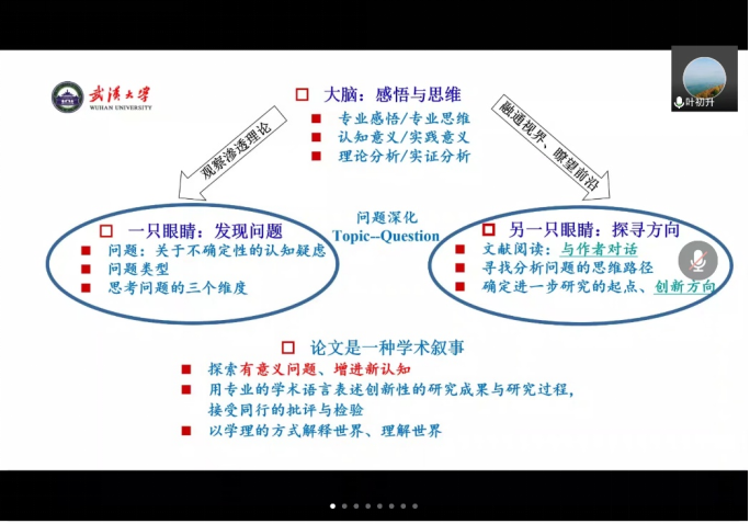 文建东教授从经济学教育和经济思想史的角度讨论如下问题:中国期刊论文和博士论文与国外英文期刊论文的差别;理论训练的重要性和博士论文的理论基础薄弱;西方经济学在中国经济学研究中的地位;中国经济学研究如何对国际学术界做出贡献。叶初升教授形象地从一只眼睛发现有意义的问题,另一只眼睛追踪前沿文献,寻觅前人分析问题的思维轨迹,辨识进一步解决问题的前行方向谈起,指出在两只眼睛的背后,大脑以专业感悟去理解问题的意义、把握其经济学蕴涵,以专业思维去设计分析框架、探索问题的内在逻辑,用实证方法检验那些“看不见”的猜测。叶教授还现身说法,介绍了自己已经发表的几篇高水平学术论文的思维轨迹,以资深研究者、优秀教师和期刊主编三重身份与从事经济学研究的师生们分享了他的学术感悟:做有思想的学者,以学理的方式解释世界;做有情怀的学术,以学术的方式热爱生活,并引导大家以情怀滋润思想、以思想引领学术,以学术担当未来,把文章写在中国大地上,告诉世界一个“理论中的中国”。报告结束后,主讲嘉宾与线上同学进行了交流互动。李政教授做了总结和评论,并对两位教授的讲座表示由衷感谢,特别对叶初升教授生日当天为老师和同学们做三个多小时精彩报告表示由衷敬意。希望大家认真领会学习报告内容。