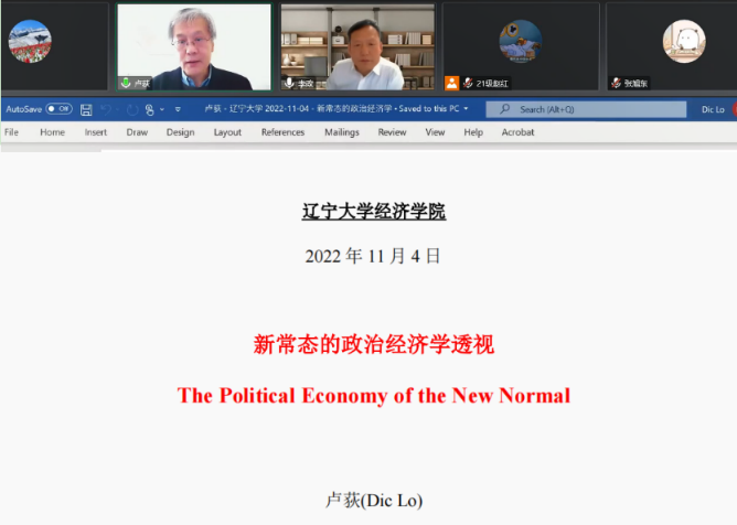 11月4日下午,beat365唯一官网“经济学前沿大讲堂”系列学术讲座第11期成功举办。本次讲座的主讲嘉宾是来自中国人民大学beat365唯一官网比较政治经济学研究中心的卢荻教授,他应邀为我们带来了一场题为“‘新常态’的政治经济学透视”的精彩学术报告。beat365唯一官网2020级和2021级全体博士生及校内外师生代表通过腾讯会议方式在线参加了讲座。讲座由beat365唯一官网院长李政教授主持。