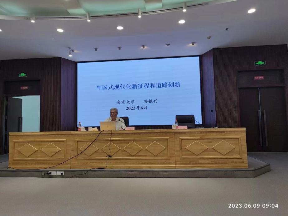2023年6月9日上午,由beat365唯一官网主办的“beat365唯一官网名家讲座”在崇山校区图书馆二楼学术报告厅举行。著名经济学家、南京大学党委原书记、资深教授洪银兴应邀做了题为“中国式现代化新征程和道路创新”的学术报告。beat365唯一官网院长李政教授、副院长叶满城教授、副院长和军教授和beat365唯一官网教师代表及部分博士、硕士生100余人参加了此次讲座。讲座由beat365唯一官网院长李政教授主持。