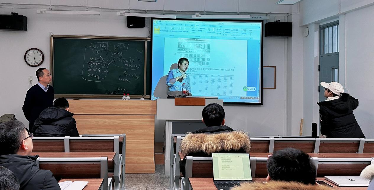 在讲座结束后,同学们积极与老师探讨本次学习内容,何彬副教授热情地与同学们展开了深入地交流与讨论。他建议同学们学习空间计量经济学前期要有充分的耐心,前期打好基础在后续操作过程中会取得事半功倍的效果。本次课程为大家做好科研提供了非常实用和有针对性的指导。