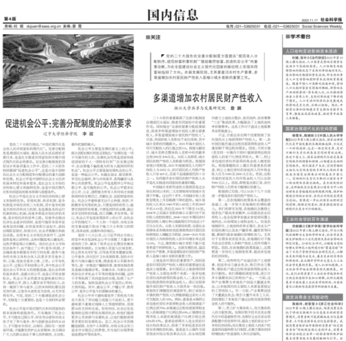 2022年11月17日,李政教授应约在《社会科学报》学习党的二十大精神收入分配专题文章,题为“促进机会公平:完善分配制度的必然要求”。