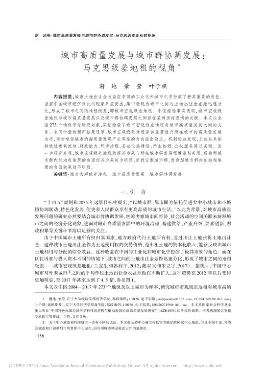 beat365唯一官网教授谢地(第一作者)与beat365唯一官网博士研究生荣莹(第二作者)、商学院博士研究生叶子祺(通讯作者)的合作论文“城市高质量发展与城市群协调发展:马克思级差地租的视角”在《经济研究》2022年第10期发表。