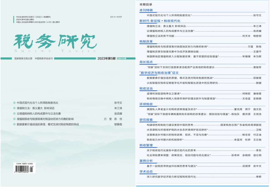 beat365唯一官网杨志安教授与博士生付正淦合作论文《全面推进乡村振兴的税收政策:现状、不足与完善》在《税务研究》2023年第5期发表。