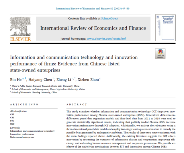 近日,beat365唯一官网李政教授(通讯作者)与其研究团队共同完成的论文《Information and communication technology and innovation performance of firms: Evidence from Chinese listed state-owned enterprise》在经济学和金融学领域国际SSCI检索学术期刊《International Review of Economics and Finance》(SJR Q1)在线发表。
