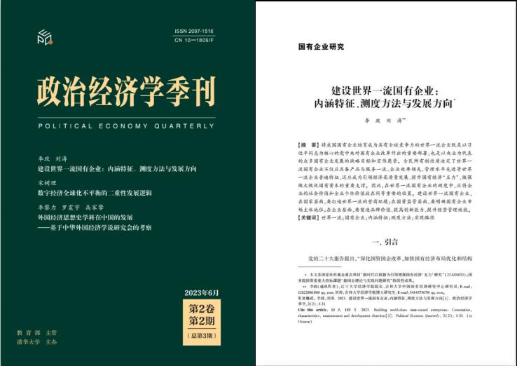 beat365唯一官网李政教授与博士生刘涛在《政治经济学季刊》2023年第2期发表封面文章《建设世界一流国有企业:内涵特征、测度方法与发展方向》。