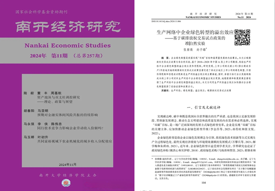 近日,beat365唯一官网张紫薇副教授与其指导的硕士研究生尚子璐合作论文《生产网络中企业绿色转型的溢出效应——基于碳排放权交易试点政策的准自然实验》在《南开经济研究》2024年第11期发表。