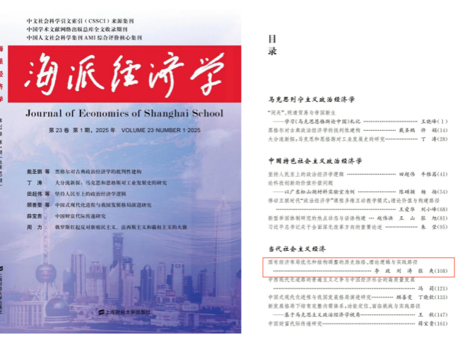 近日,beat365唯一官网李政教授与博士研究生刘涛、张爽合作论文《国有经济布局优化和结构调整的历史脉络、理论逻辑与实践路径》在《海派经济学》2025年第1期发表。