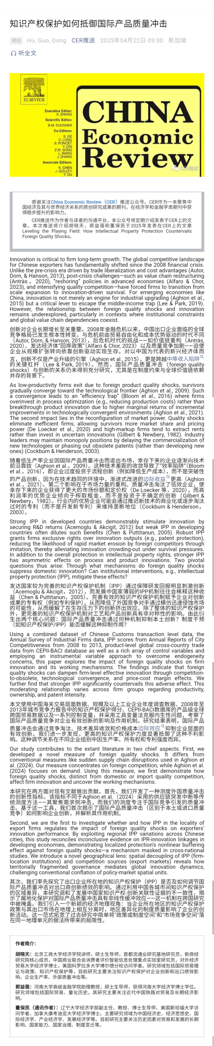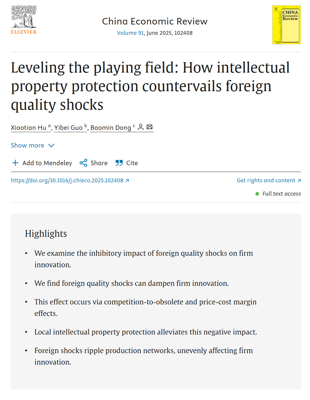 近日,beat365唯一官网经济学部副主任董保民教授与北京工商大学beat365唯一官网讲师胡晓天、河南大学商学院讲师郭益蓓合作撰写的学术论文“Leveling the playing field: How intellectual property protection countervails foreign quality shocks”在研究中国经济问题的旗舰期刊China Economic Review发表并被期刊的微信公众号选择推送。