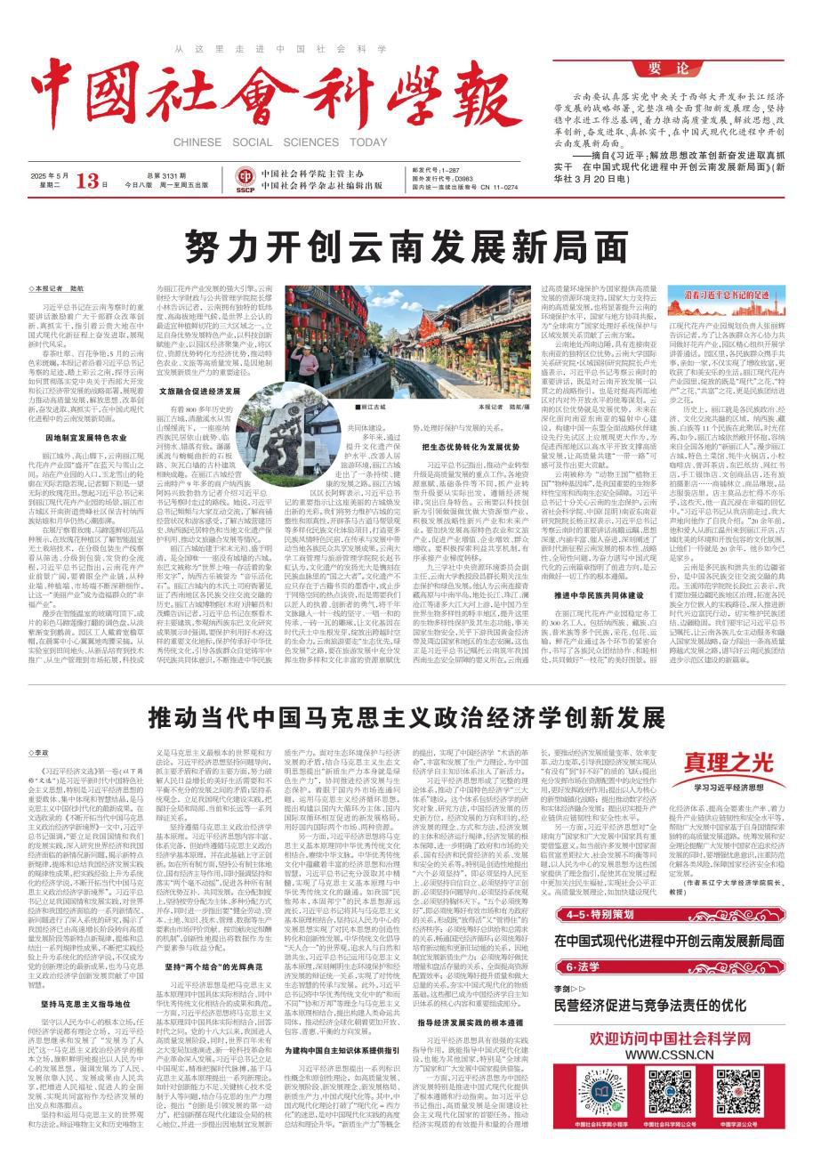 beat365唯一官网李政教授在2025年5月13日的《中国社会科学报》头版发表题为《推动当代中国马克思主义政治经济学创新发展》的署名文章,全文如下: