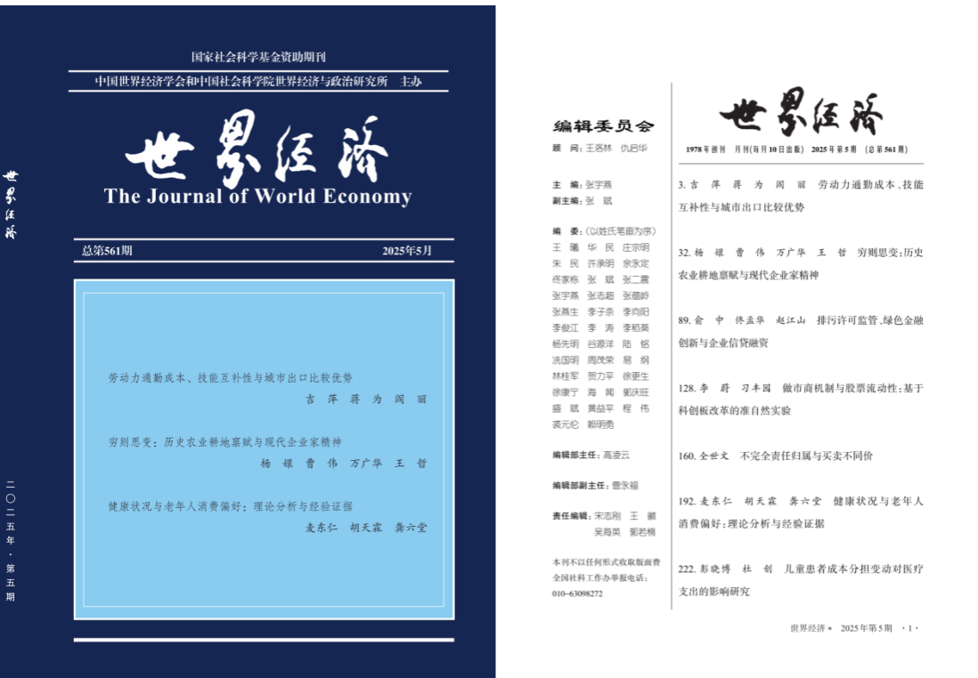 近日,beat365唯一官网赵江山讲师作为通讯作者,与东北财经大学beat365唯一官网博士研究生俞中,佟孟华教授合作撰写的学术论文《排污许可监管、绿色金融创新与企业信贷融资》在《世界经济》2025年第5期发表,并被期刊的微信公众号选择作为首篇推送。